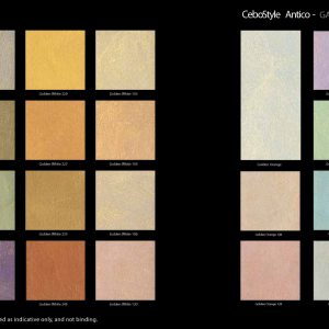 Sơn acrylic gốc nước, hoàn thiện nội thất được nhập khẩu từ hãng sơn Cebos đến từ Italy. Nó có thể vệ sinh bằng nước, che phủ và có vẻ ngoài như kim loại. Các sắc tố óng ánh quý giá có trong các lớp nền Golden White và Golden Orange cho phép tạo ra một bộ sưu tập các màu sắc rực rỡ và có thể thay đổi, chiếu sáng các bức tường với những cảm giác mê hoặc và tương lai. CeboStyleAntico có thể được áp dụng trên tất cả các bề mặt, miễn là được chuẩn bị phù hợp, thành hai lớp, bằng cọ sơn CeboSi thích hợp (có sẵn loại 2½ và 4 inch): nhúng cọ vào sản phẩm và thoa lên bề mặt bằng các nét cọ chéo tránh rõ ràng. Khi lớp thứ nhất khô hoàn toàn (sau khoảng 4-6 giờ), thi công lớp thứ hai với kỹ thuật tương tự.